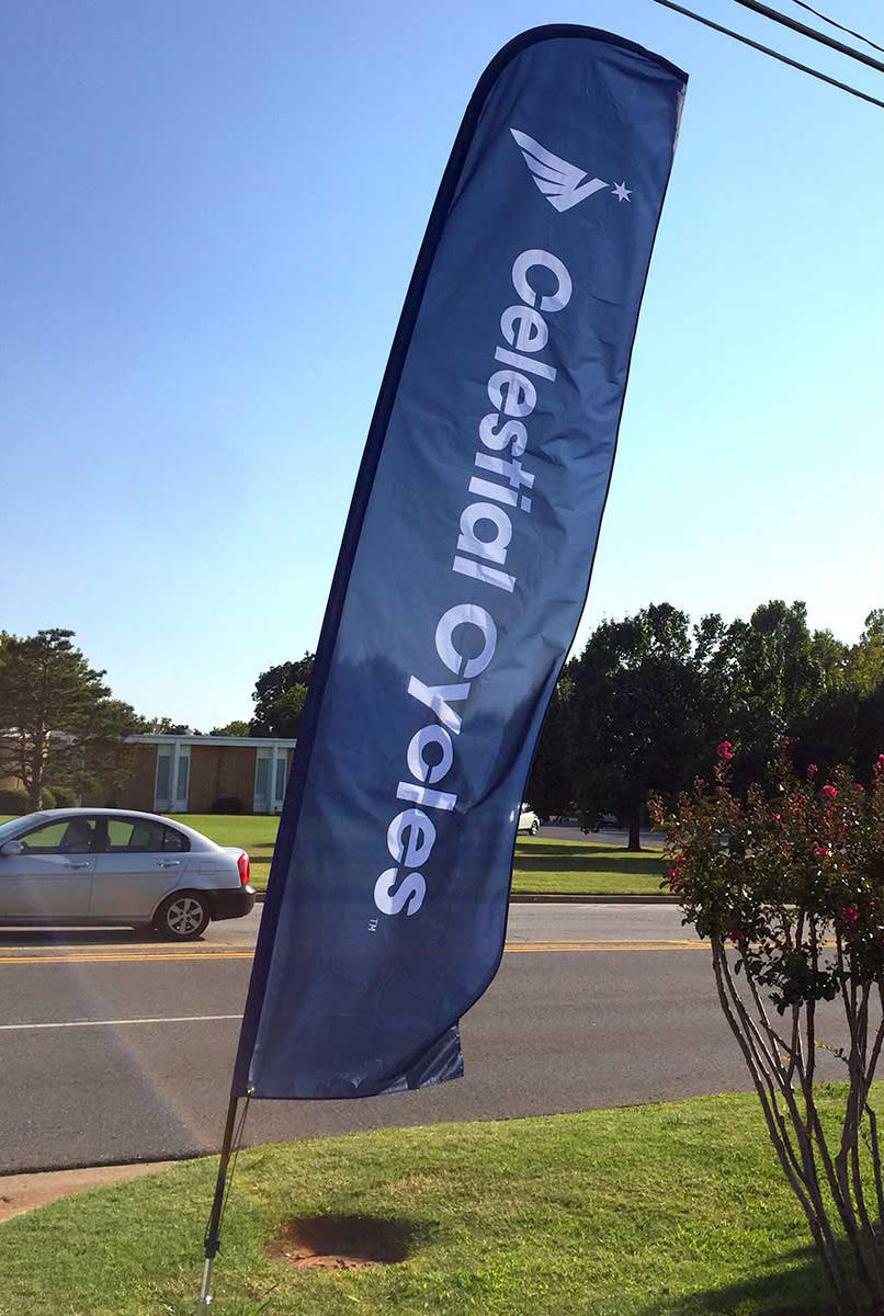 Our standard material for custom feather flags is a 110g knit polyester flag material. This material prints beautifully, stands up to the elements and will be sure to catch the attention of anyone passing by.