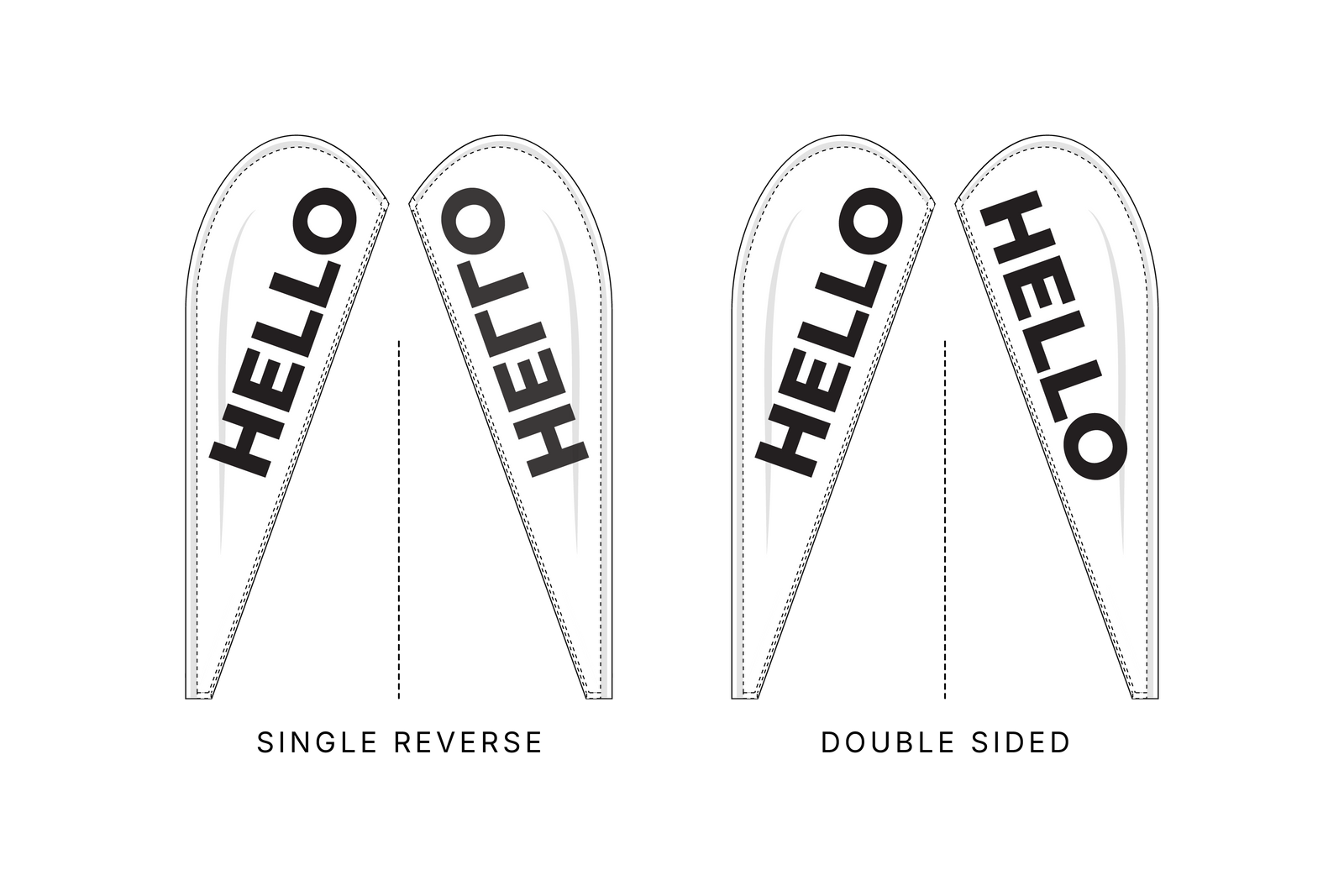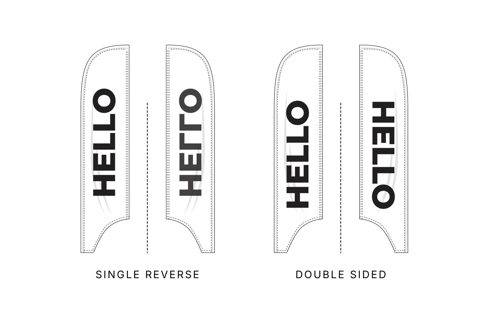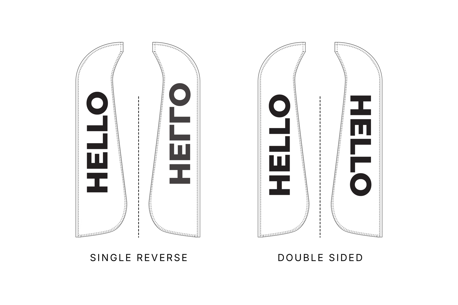 Single reverse feather flags are printed on a single piece of fabric, where the ink fully dyes the material so your design is visible from both the front and the back. The image on the back will be a reverse (or mirrored) image of the front.