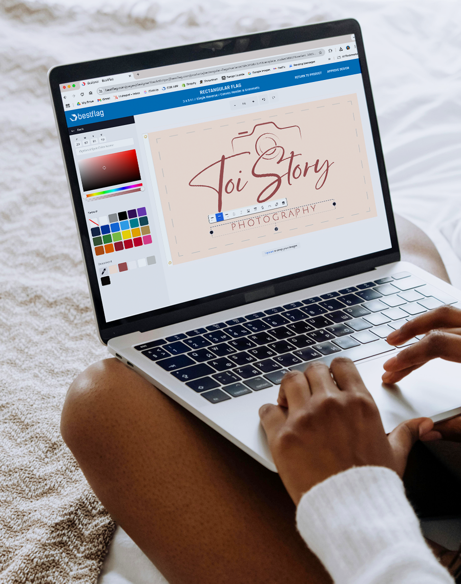 Our online designer has a simple easy to use set of tools that allow you to quickly select background colors, upload images, and add your own text.