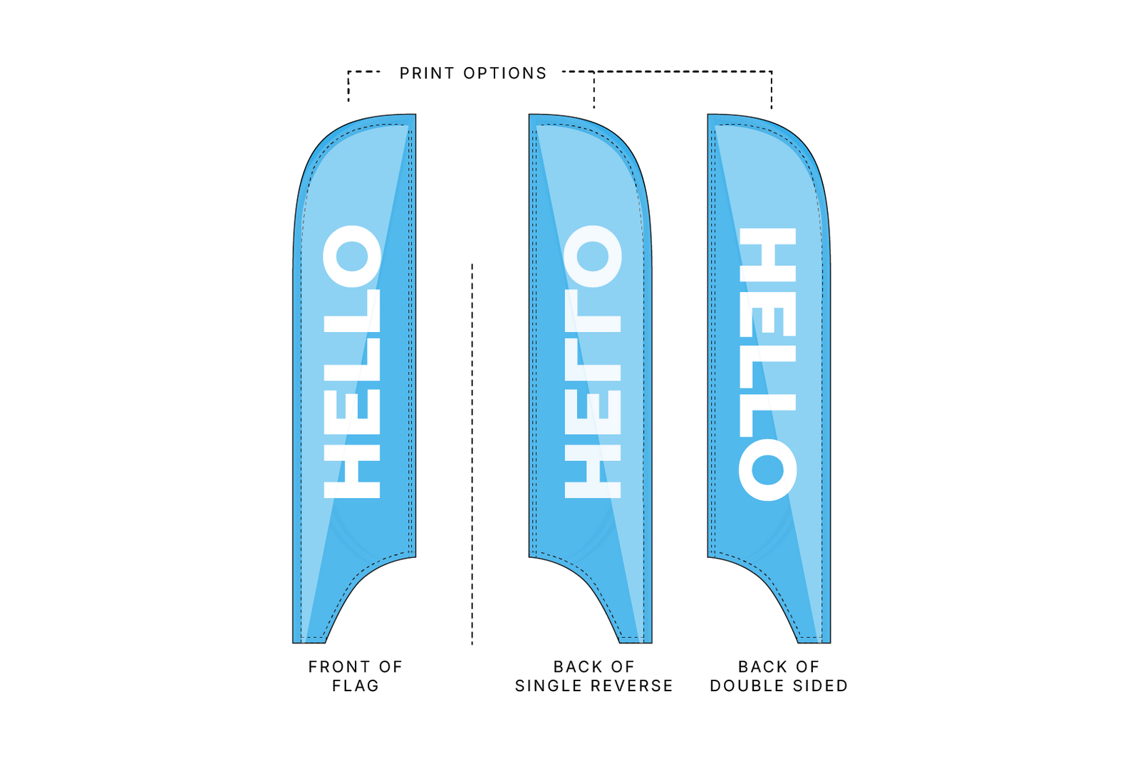 Single reverse razor flags are printed on a single piece of fabric, where the ink fully dyes the material so your design is visible from both the front and the back. The image on the back will be a reverse (or mirrored) image of the front.