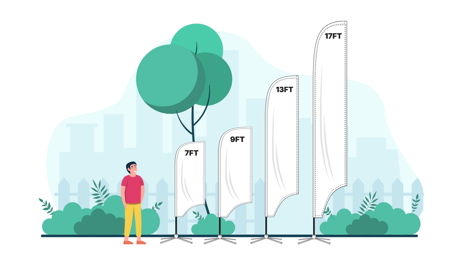 Our Custom Razor Flags come in four sizes, ranging from 7' to 17' tall when installed on our premium poles. Listed below are our graphic dimensions and finished total height when used with our premium feather flag poles.