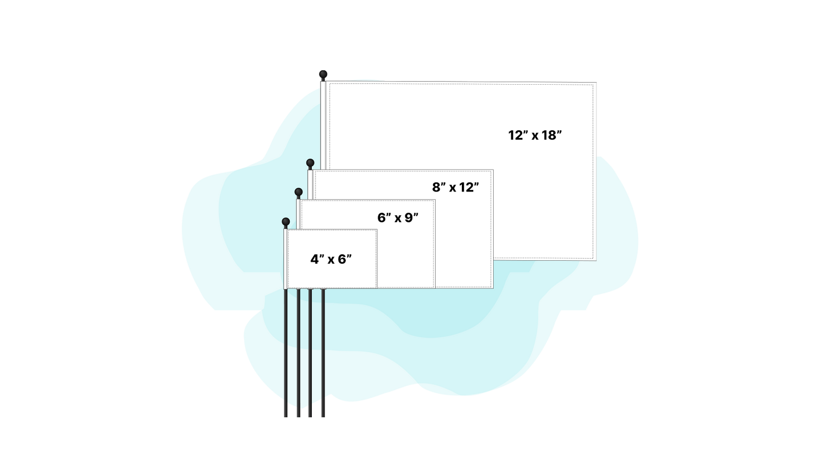 Our standard stick flags range from 4” x 6” to 12” x 18”.