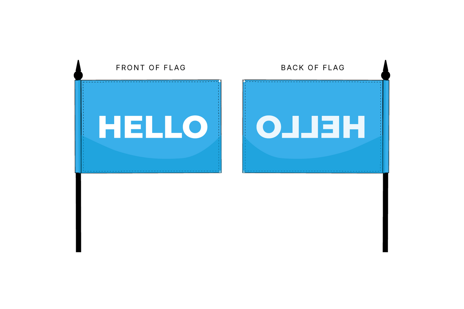 Because stick flags are small promotional items, we typically only offer single reverse printing. Ink is directly printed onto the front of the flag, and the material allows the image to bleed through so it is visible on the back. The back side will show a mirror image of the front, which is where the “reverse” in “single reverse” comes from. If you absolutely need a double sided stick flag, please let us know and we will try to work some magic for you. It has been done before, but we just don’t typically recommend it.