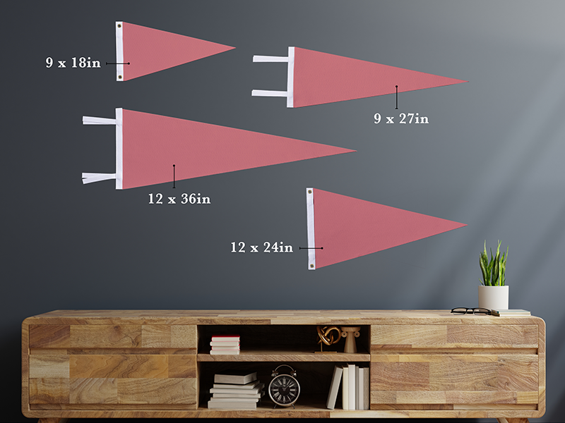 We offer four sizes of our Felt Pennants. Our most popular size is the 9" x 27" - the true classic. Additionally, we offer a larger version of that style in a 12" x 36", and two options with a slightly taller canvas at 9" x 18" and 12" x 24".