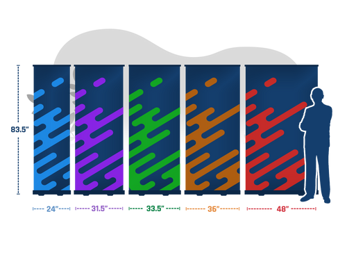 The Starter Custom Retractable Banner is available in five sizes, from 24 IN to 48 IN wide, with all options measuring 83.5 IN tall. The 24 IN version is available with a black base, while all other versions come in either black or silver.