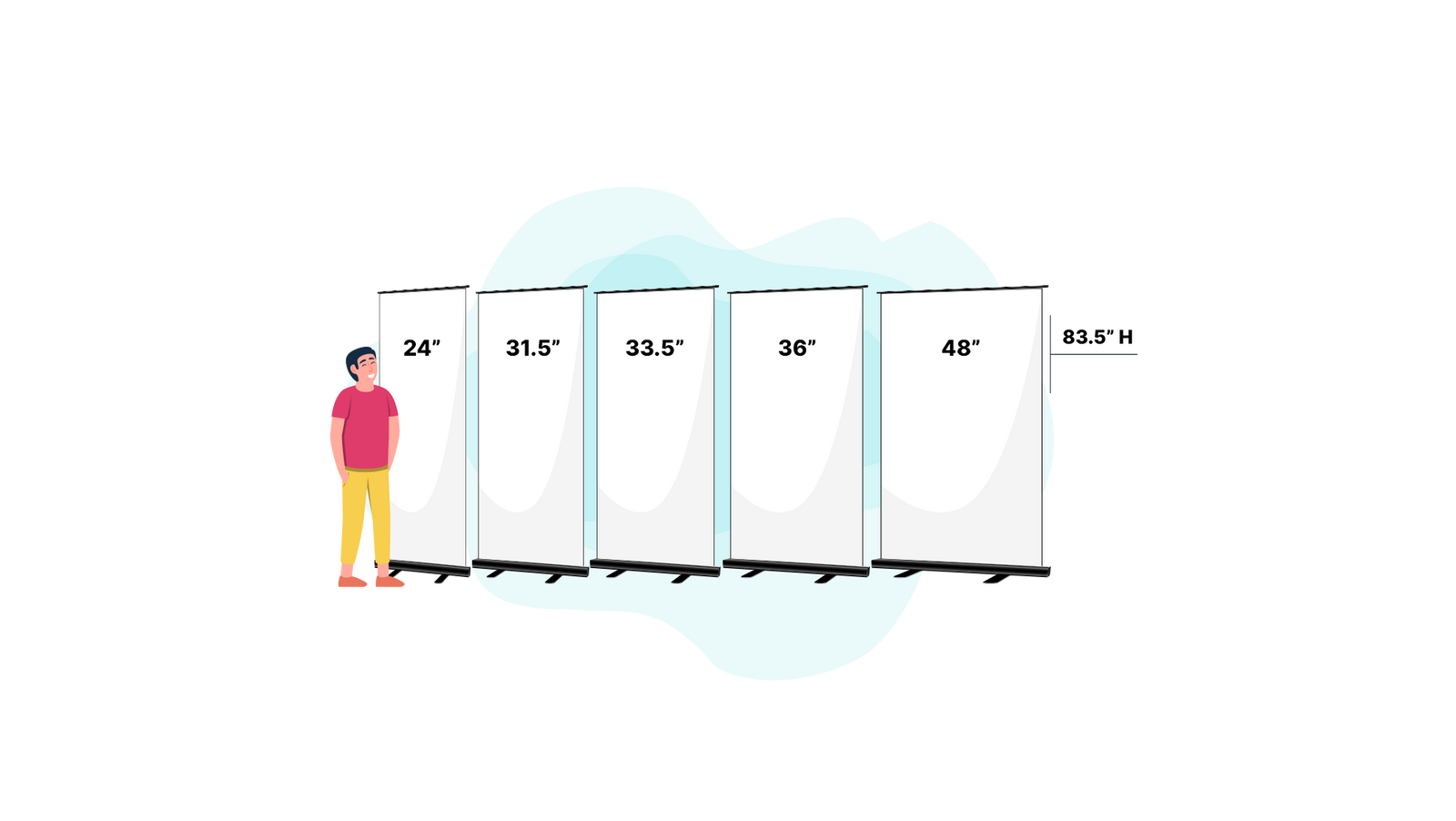 The Starter Custom Retractable Banner is available in five sizes, from 24 IN to 48 IN wide, with all options measuring 83.5 IN tall. The 24 IN version is available with a black base, while all other versions come in either black or silver.